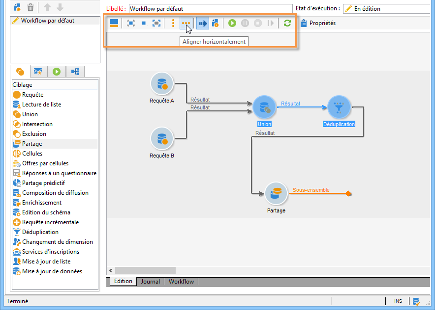 La cible principale d’une diffusion peut également être définie au travers d’un workflow de campagne : cet environnement graphique permet de créer une cible via des requêtes, des tests et des opérateurs tels que des unions, déduplications, partages, etc.