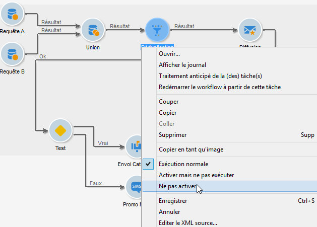 Vous pouvez également arrêter automatiquement un workflow de ciblage lorsque l'exécution arrive à une activité. Pour cela, cliquez avec le bouton droit sur l'activité à partir de laquelle le workflow de ciblage sera suspendu et choisissez Ne pas activer.