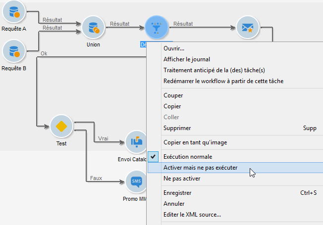 Vous pouvez également suspendre automatiquement un workflow de ciblage lorsque l'exécution arrive à une activité. Pour cela, cliquez avec le bouton droit sur l'activité à partir de laquelle le workflow de ciblage sera suspendu et choisissez Activer mais ne pas exécuter.