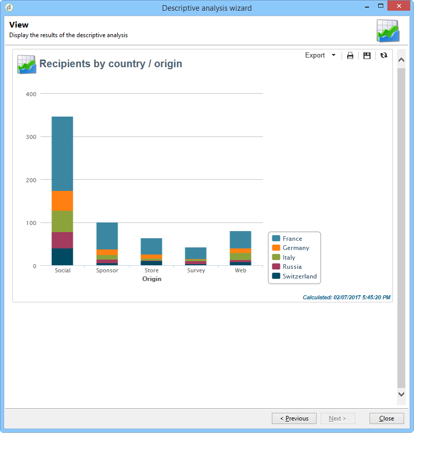 설명 분석 마법사는 Adobe Campaign 보고서처럼 강력하지는 않지만 데이터베이스 컨텐츠나 데이터 선택에 대한 간단한 개요를 제공합니다.