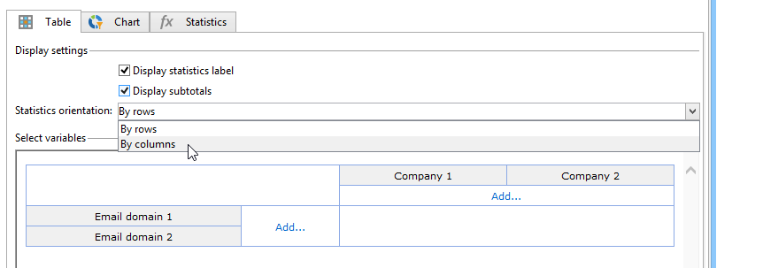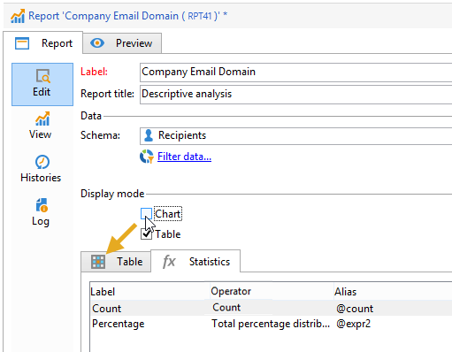 를 사용하여 보고서를 만들 때 qualitative distribution 기본적으로 템플릿, 테이블 및 차트 표시 모드가 선택됩니다. 하나의 디스플레이 모드만 원하는 경우 해당 상자를 선택 취소합니다. 즉, 선택한 표시 모드의 탭만 사용할 수 있습니다.