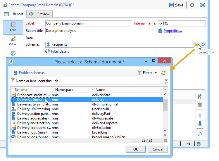 보고서의 스키마를 변경하려면 Select the link 데이터베이스에서 다른 테이블을 선택합니다.