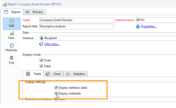 설명 분석 차트 및 테이블에서 데이터의 표시 및 레이아웃을 개인화할 수 있습니다. 모든 옵션은 Adobe Campaign 트리의 Edit 각 보고서의 탭.