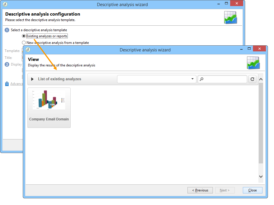 Existing analyses and reports을(를) 선택하고 Next을(를) 클릭합니다 .