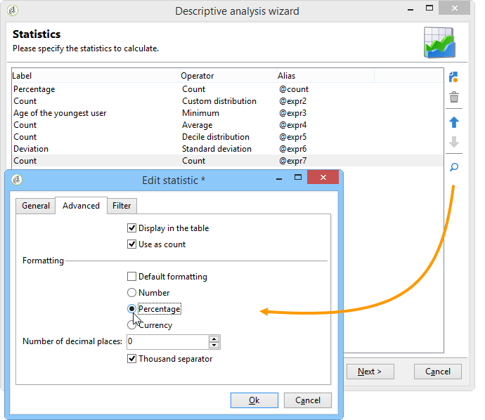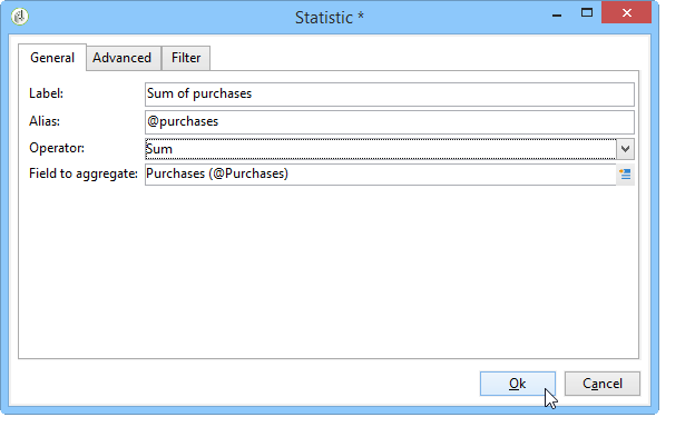 데이터의 일부에 대한 통계를 생성하려는 경우 필터를 정의할 수 있습니다. 이렇게 하려면 Advanced settings… 아래와 같이 적용할 필터를 링크하고 정의합니다.