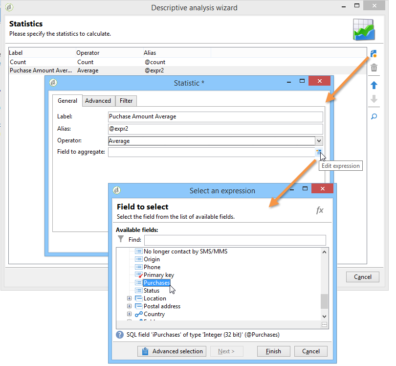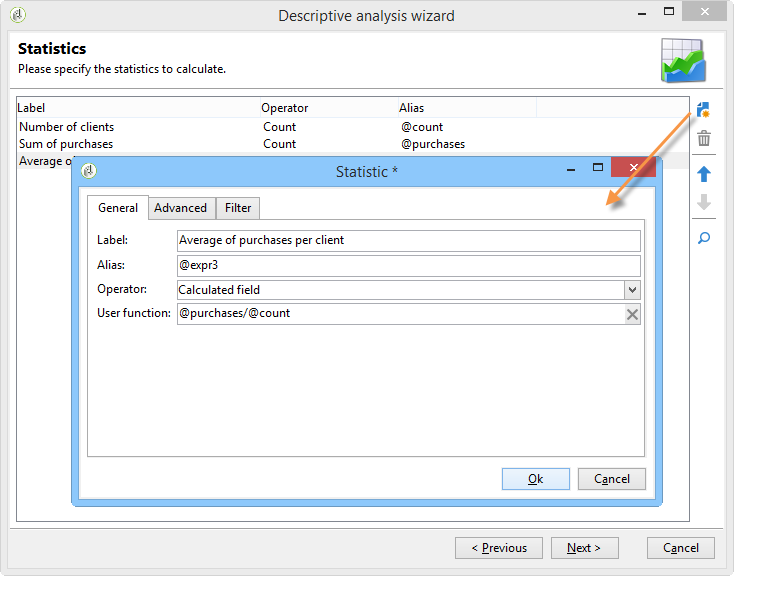 새 만들기 Calculated field 통계를 입력하고 다음 공식을 입력합니다 User function 필드: @purchases/@count.