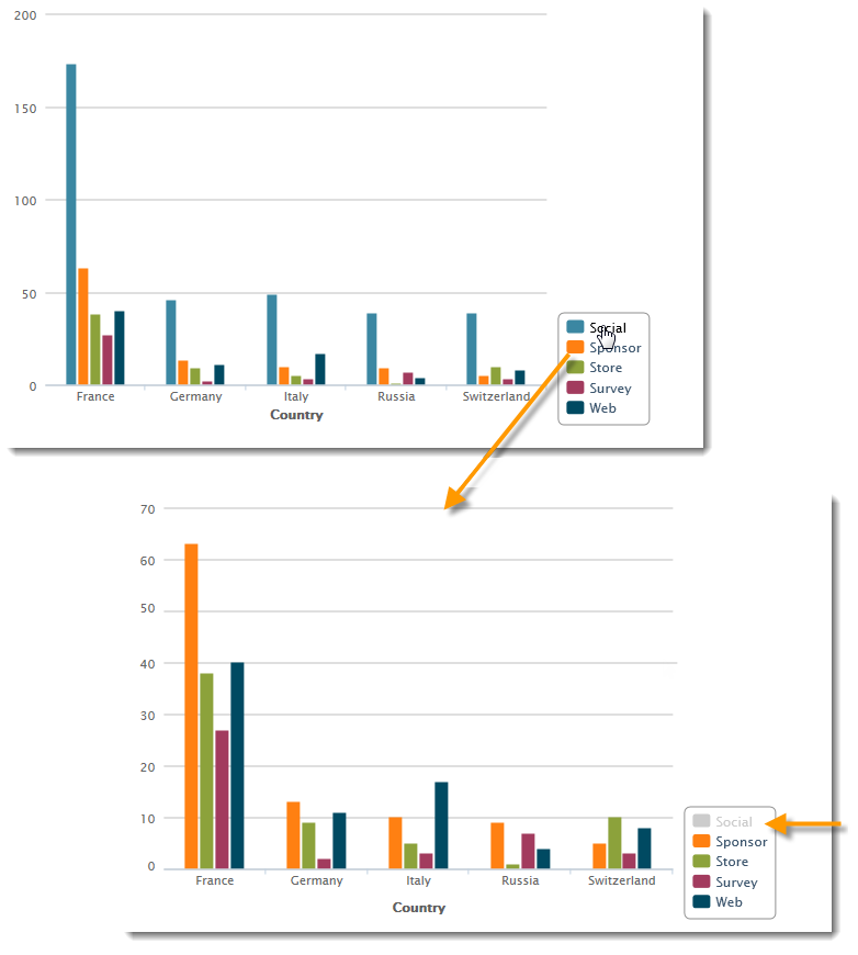 보고서에 차트가 포함되어 있으면 범례 레이블을 사용하여 표시된 정보를 필터링할 수 있습니다. 차트에서 표시를 활성화/비활성화하려면 레이블을 클릭합니다.
