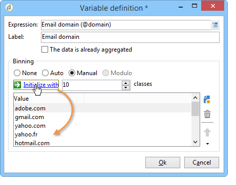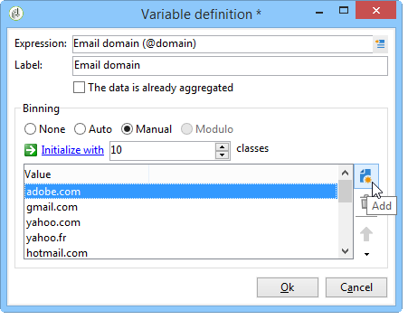 Auto : 이 옵션을 사용하면 가장 자주 표시되는 값 n개를 표시할 수 있습니다. 자동으로 계산되며, 각각 저장소 수와 비교하여 변수의 백분율을 나타냅니다. 숫자 값의 경우 Adobe Campaign은 자동으로 n 클래스를 생성하여 데이터를 로 정렬합니다.