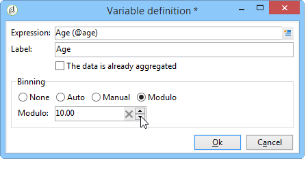 Modulo : 숫자 값의 경우 값 그룹을 만들 수 있습니다. 예를 들어 값이 10인 모듈로를 사용하면 10씩 변경되는 값의 간격을 만들 수 있습니다.