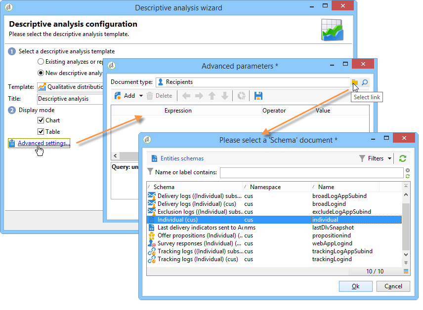 표준 수신자 이외의 테이블을 분석하려면 다음을 수행합니다(nms:recipient)을 클릭하고 Advanced settings… 마법사의 마지막 단계에서 연결하고 설정과 일치하는 표를 선택합니다(이 경우 ) cus:개별: