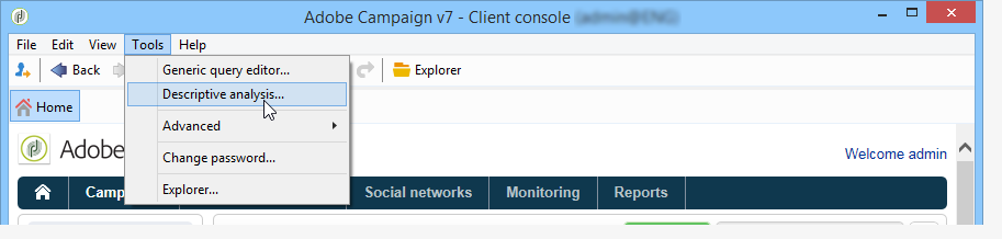 설명 분석 마법사는 Tools > Descriptive analysis 메뉴: 이 경우 분석은 기본적으로 수신자에 대한 관심입니다(nms:recipient). Adobe Campaign 데이터베이스의 모든 데이터에 적용됩니다.