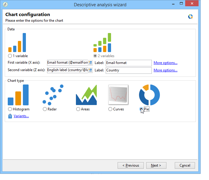 설명 분석 마법사의 첫 번째 단계에서는 테이블 없이 데이터를 차트 양식으로만 표시하도록 선택할 수 있습니다. 이 경우 그래픽을 구성할 때 변수 선택을 수행해야 합니다. 먼저 표시할 변수 수를 선택하고 관련 데이터베이스에서 필드를 선택해야 합니다.