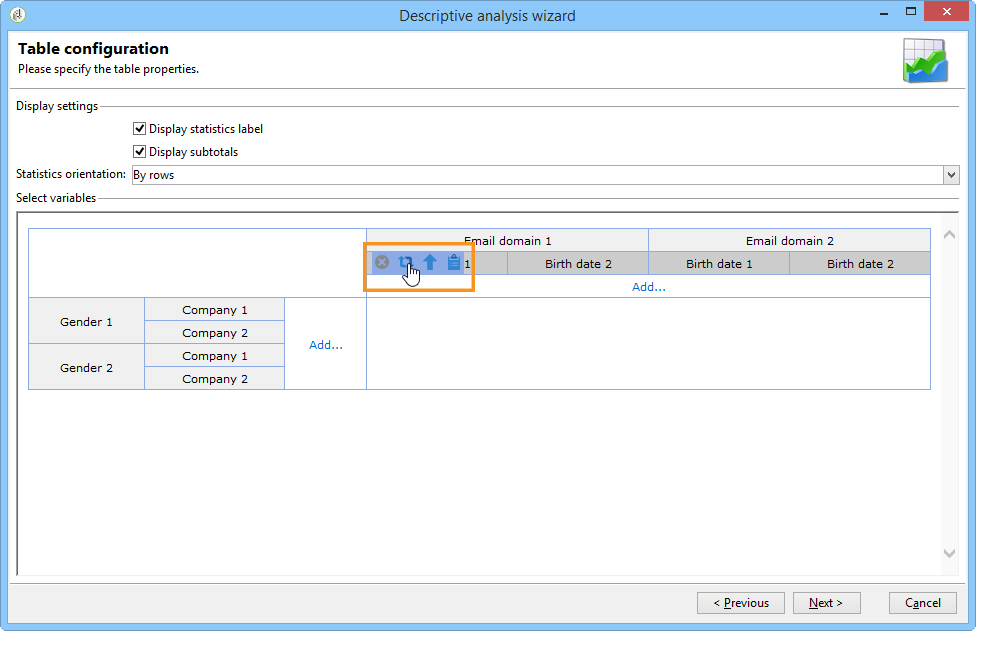 도구 모음을 사용하여 표에 있는 변수 표시를 개인화합니다. 열을 삭제하고, 데이터를 열이 아닌 라인으로 표시하고, 열을 왼쪽이나 오른쪽으로 이동하거나, 값 계산을 보거나 변경할 수 있습니다.