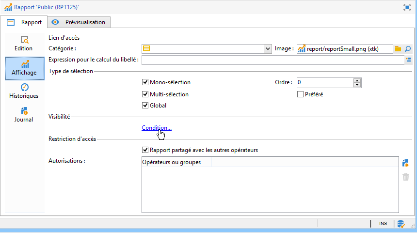 Définissez le contexte d'affichage du rapport dans la plateforme Adobe Campaign à partir de l'onglet Affichage. L'accès à un rapport dépend de son type de sélection, de ses conditions d'affichage et des autorisations d'accès.