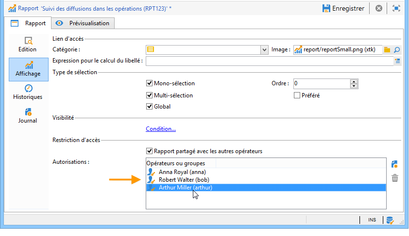 Le rapport peut également être partagé avec des opérateurs ou des groupes d'opérateurs spécifiques qui sont ajoutés dans la fenêtre des autorisations.