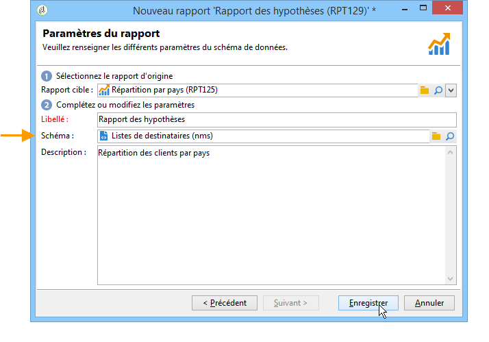 Précisez un libellé et choisissez le schéma. Dans notre exemple nous choisissons la table des listes de destinataires.