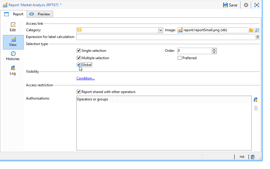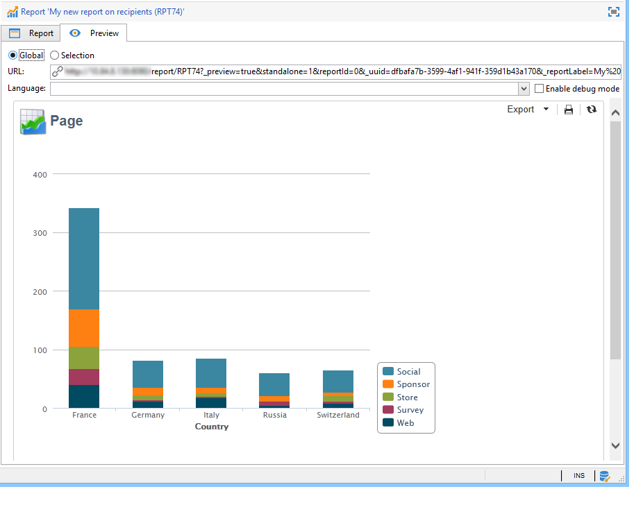 이 두 옵션은 보고서의 표시 설정을 기반으로 선택됩니다. 표시 설정이 Global를 선택하는 경우 Global 미리 보기 옵션. 표시 설정이 Single selection 또는 Multiple selection, Selection 미리 보기 옵션을 선택해야 합니다.