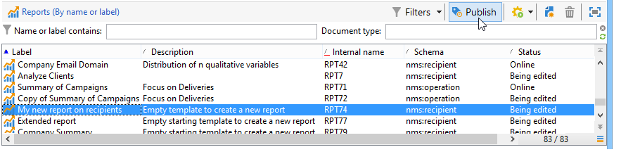 보고서를 다른 연산자와 공유하고 사용 가능한 보고서 목록에 표시하려면 보고서를 게시해야 합니다(또한 보고서 표시 컨텍스트). 보고서가 변경될 때마다 이 작업을 다시 수행해야 합니다.