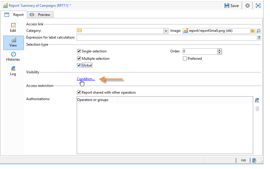 Adobe Campaign 플랫폼에서 보고서의 표시 컨텍스트를 Display 탭. 보고서에 대한 액세스 권한은 선택 유형, 표시 조건 및 액세스 권한에 따라 다릅니다.