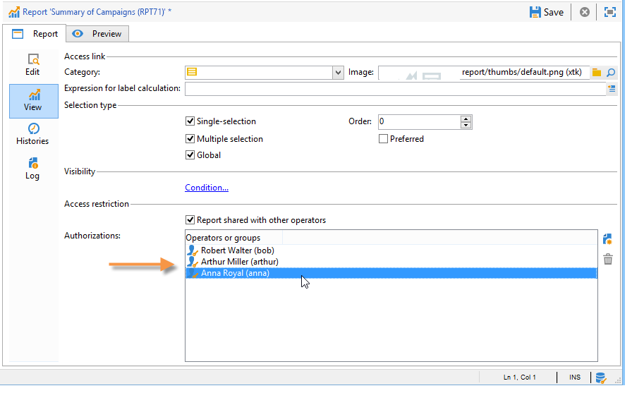또한 권한 창을 통해 추가된 특정 운영자 또는 운영자 그룹과 보고서를 공유할 수도 있습니다.