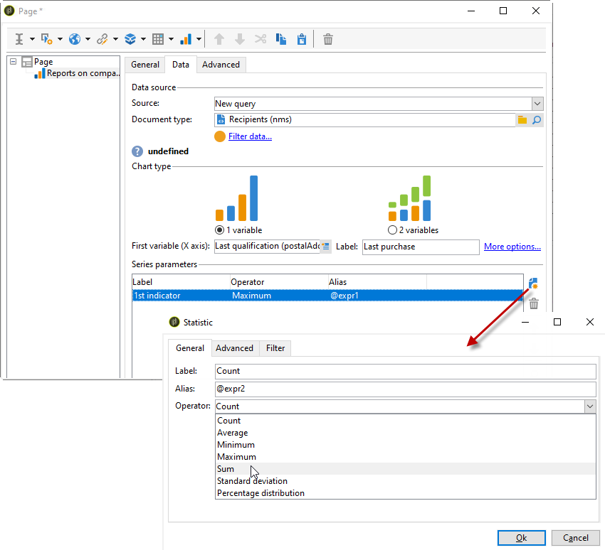 새 통계를 만들려면 Add 아이콘을 클릭하고 적절한 창을 구성합니다. 사용 가능한 계산 유형은 아래에 자세히 설명되어 있습니다.