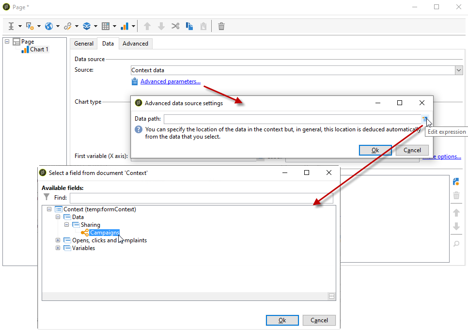 컨텍스트 데이터를 사용하려면 다음을 선택합니다 Context data 에서 Source 드롭다운을 클릭하고 Advanced settings… 링크를 클릭합니다. 그런 다음 통계가 우려되는 데이터를 선택합니다.