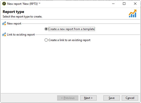 Create a new report from a template을(를) 선택하고 Next을(를) 클릭합니다 .