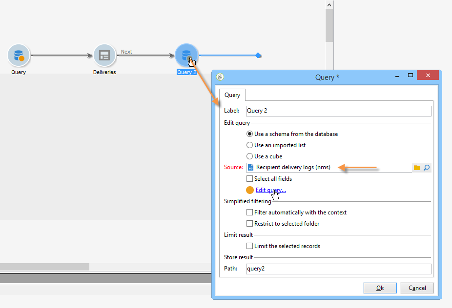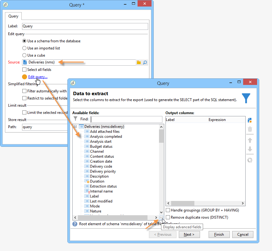 을(를) 클릭합니다. Edit query 고급 필드를 링크하고 표시합니다.