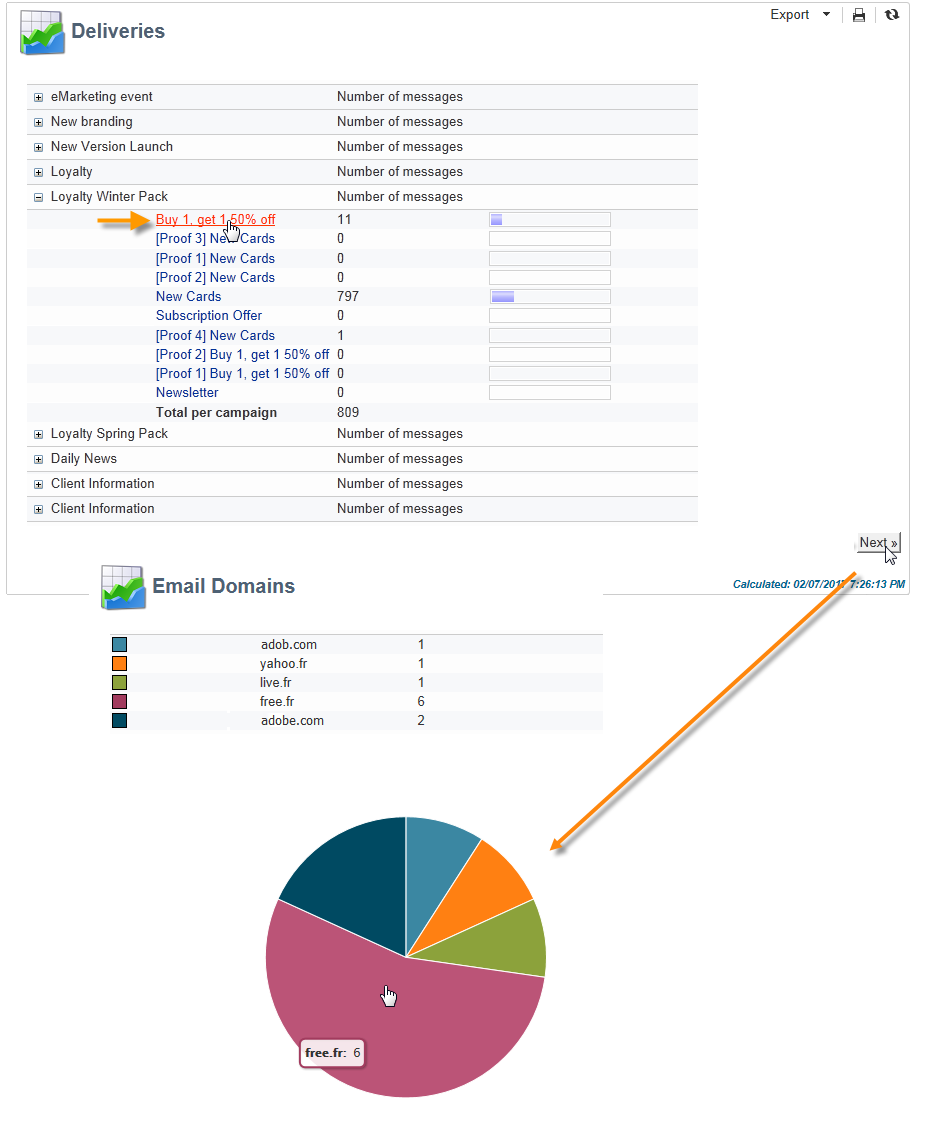 이 예에서는 두 페이지로 구성된 보고서를 만듭니다. 첫 번째 페이지에는 전송된 메시지 수뿐만 아니라 목록, 캠페인당 총 게재 수가 포함됩니다. 게재 이름은 클릭 가능한 링크이며 보고서의 두 번째 페이지로 이동하여 테이블과 차트로 선택한 게재에 대한 이메일 도메인별 게재 분류를 볼 수 있습니다. 두 번째 페이지에서 표는 차트의 범례 역할을 합니다.