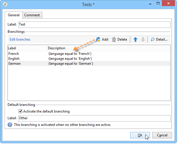 A Test 활동은 차트의 시작 부분에 배치하여 예를 들어 컨텍스트 또는 운영자 프로필에 따라 표시를 조건으로 지정할 수 있습니다.