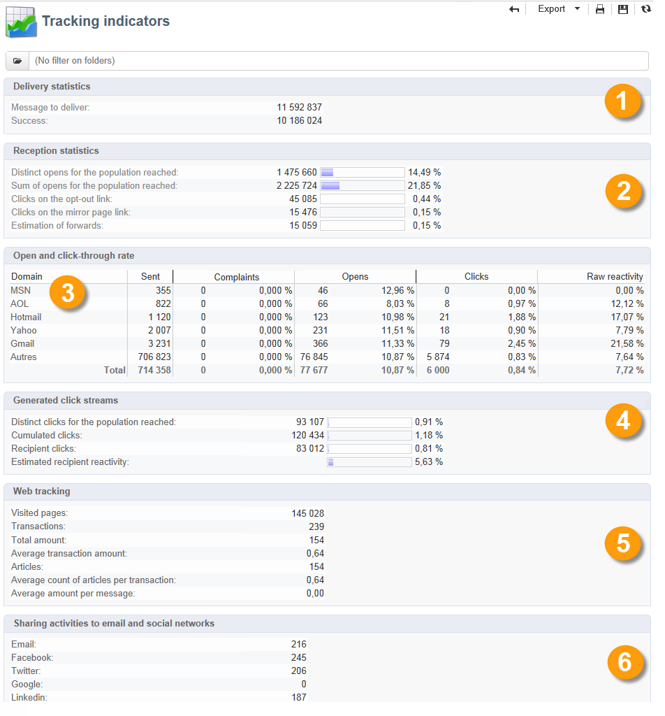 이 보고서는 게재를 받을 때 수신자의 동작을 추적하기 위한 주요 지표를 결합합니다. 게재 및 수신 통계, 열기 및 클릭스루 비율, 생성된 클릭 스트림, 웹 추적 및 소셜 네트워크에 대한 활동 공유를 제공합니다.