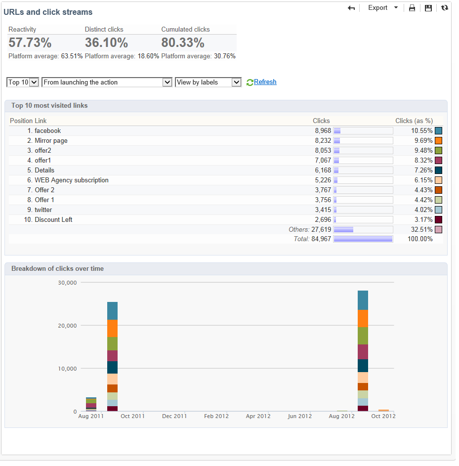 Platform average : 각 비율(반복, 개별 클릭 및 누적 클릭)에 따라 표시되는 이 평균 비율은 이전 6개월 동안 전송된 게재에 대해 계산됩니다. 유형화와 동일한 채널의 게재 만 고려합니다. 증명을 제외합니다.