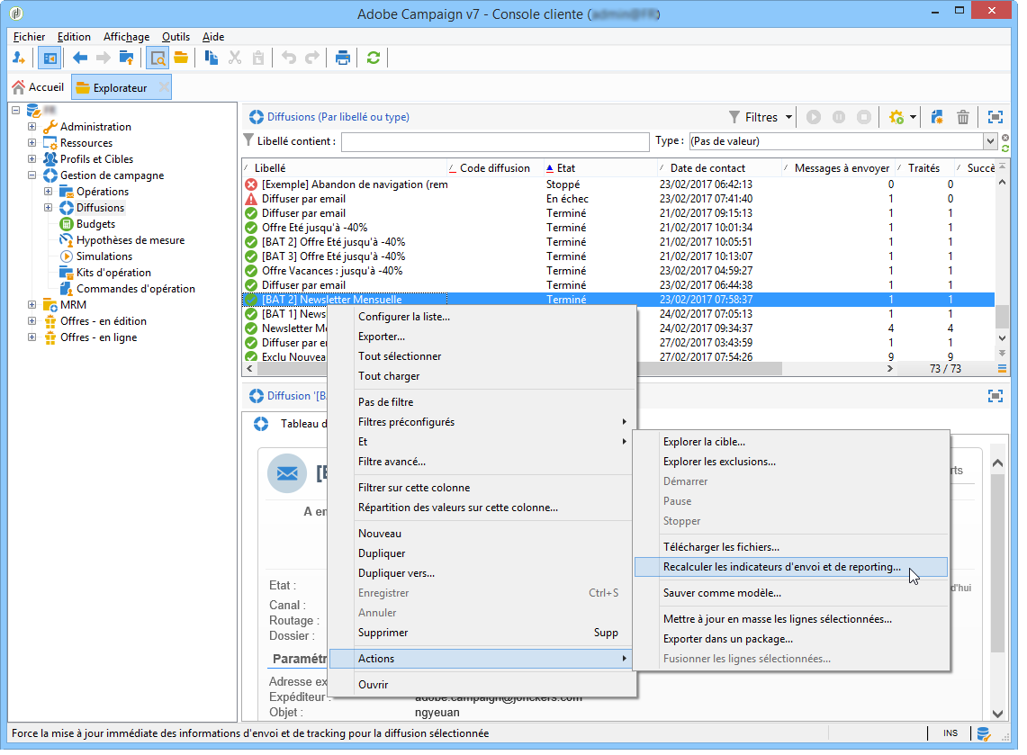 Si vous observez une désynchronisation ou une incohérence de certains indicateurs, sélectionnez la diffusion concernée dans l'explorateur Adobe Campaign, cliquez avec le bouton droit et choisissez Actions > Recalculer les indicateurs de diffusion et de tracking. Cliquez sur Suivant puis sur Terminer.