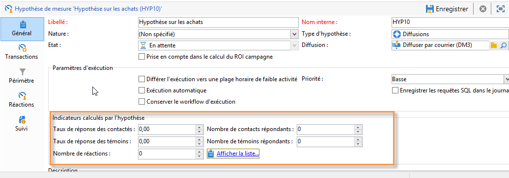 Dans l’arborescence d’Adobe Campaign, accédez au nœud Gestion de campagnes > Hypothèses de mesure pour vérifier les indicateurs calculés par l’hypothèse.