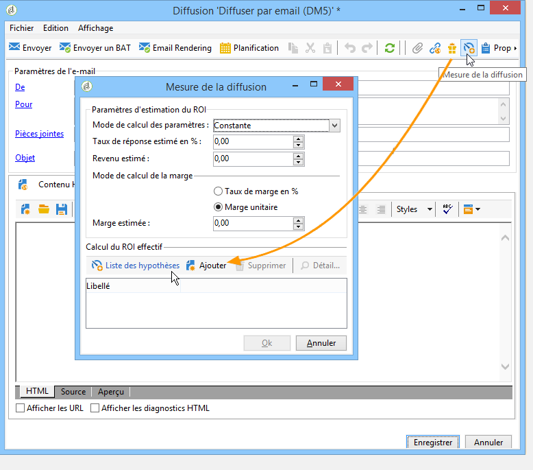 Ouvrez la Diffusion courrier et cliquez sur l'icône Mesure de la diffusion, puis sur Ajouter.