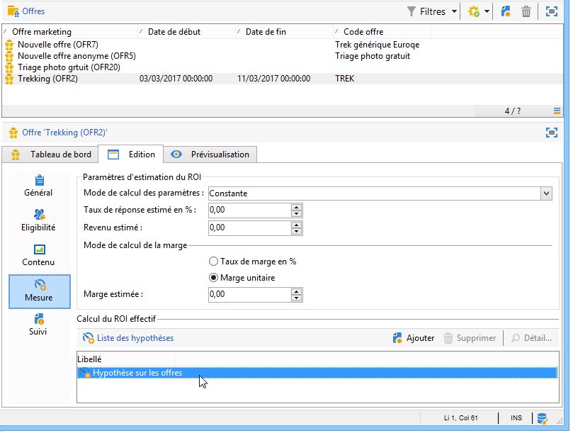 Les hypothèses faites sur une offre sont référencées dans l'onglet Mesure de l'offre.