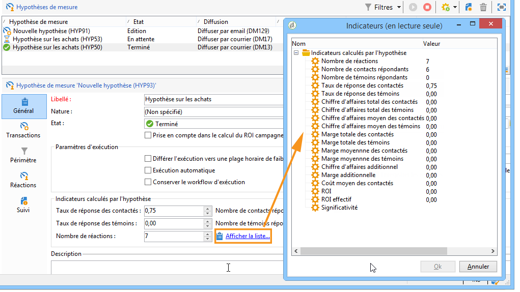 Sélectionnez l'hypothèse voulue dans la liste et cliquez sur l'onglet Réactions afin de voir la liste des destinataires susceptibles de faire un achat suite à la campagne marketing.