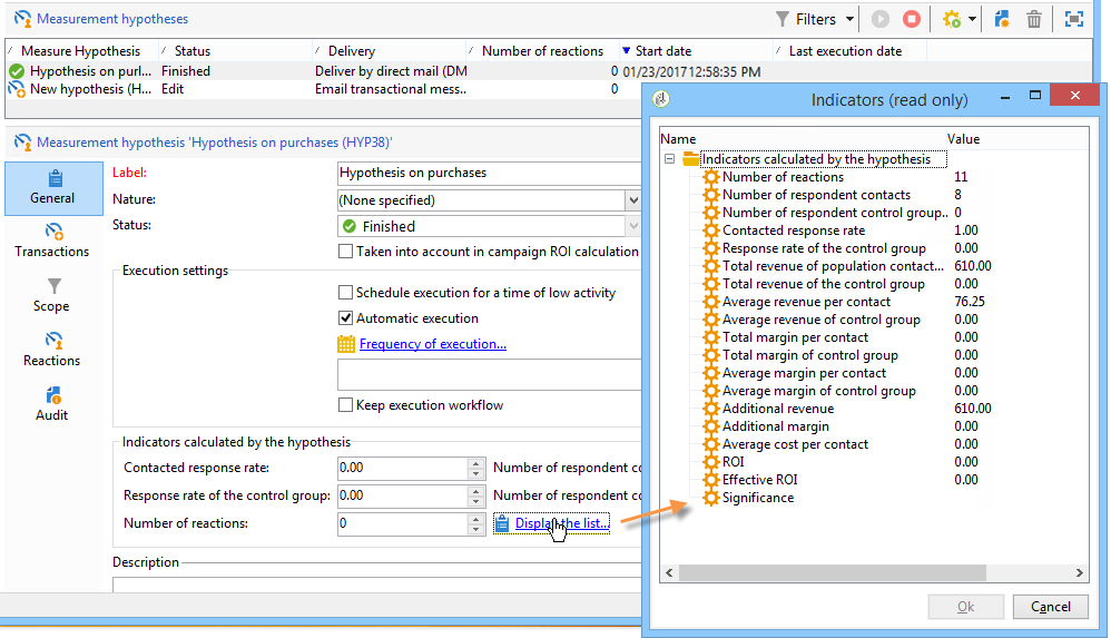원하는 가설을 선택하고 을(를) 클릭합니다 Reactions 탭하여 마케팅 캠페인 다음에 구매할 수 있는 수신자 목록을 볼 수 있습니다.