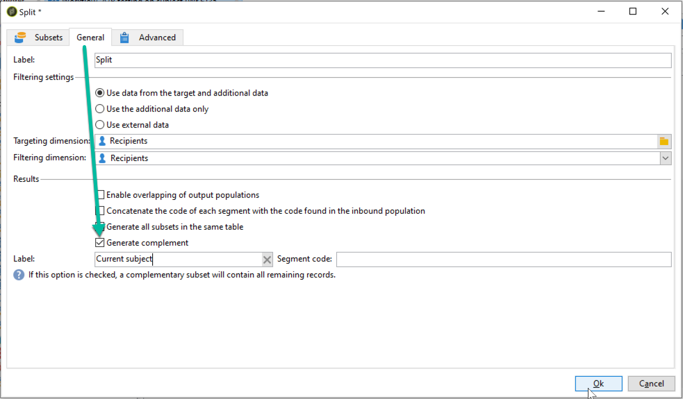 현재 주제와 함께 Newsletter를 나머지 모집단으로 보내려면 전환을 추가합니다. 이렇게 하려면 를 활성화합니다 Generate complement 옵션 General 탭.