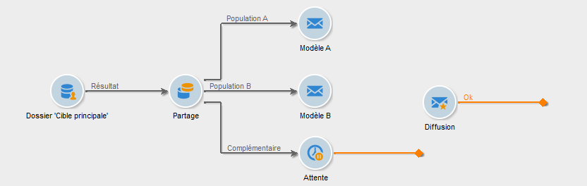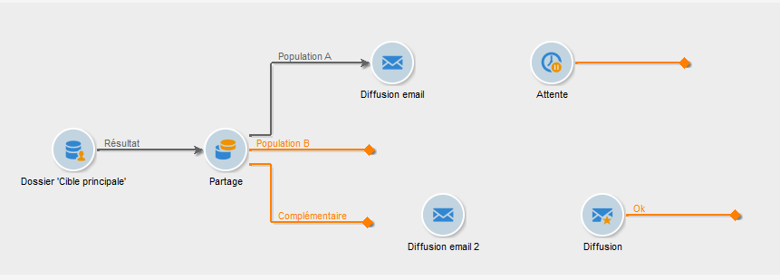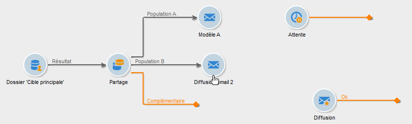 Depuis l'activité Partage, rattachez la transition destinée à la population A à l'une des diffusions e-mail déjà présentes dans le workflow.
