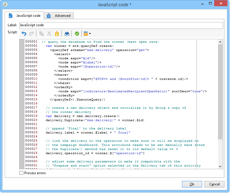 스크립트의 첫 번째 부분은 질의입니다. 다음 queryDef 명령을 사용하면 NmsDelivery 테이블 타겟팅 워크플로우를 실행하고 예상 열기 수를 기준으로 정렬하여 생성된 게재 항목을 정렬하면 가장 높은 열기 비율이 있는 게재의 정보가 복구됩니다.
