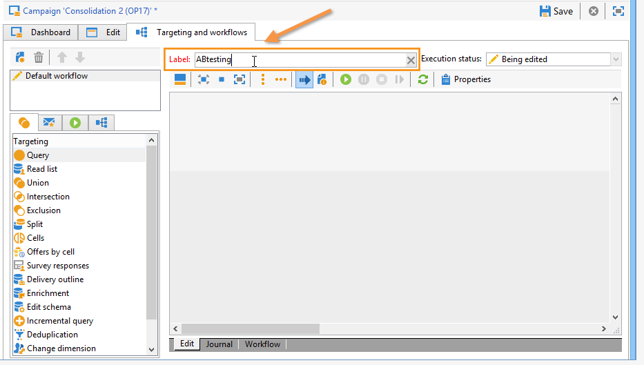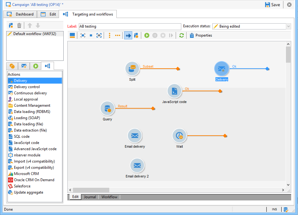 에서 워크플로우를 만들어야 합니다 Targeting and Workflows 캠페인의 탭입니다. 그건… Query 활동, Split 두 개 연결된 활동 Email delivery 활동, Wait 활동, JavaScript code 활동 및 Delivery 활동.