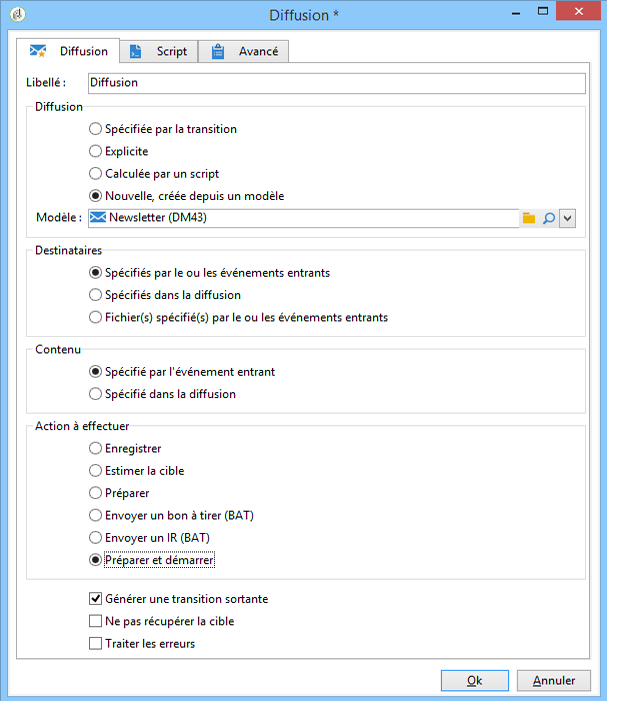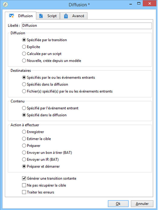L'action de diffusion à démarrer est renseignée à partir de la transition.