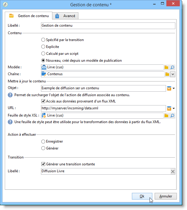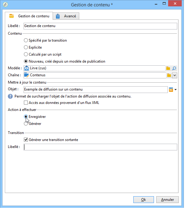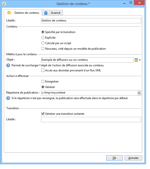 Le contenu à publier est renseigné à partir de la transition entrante.