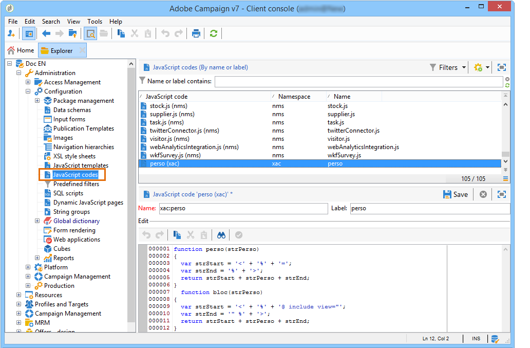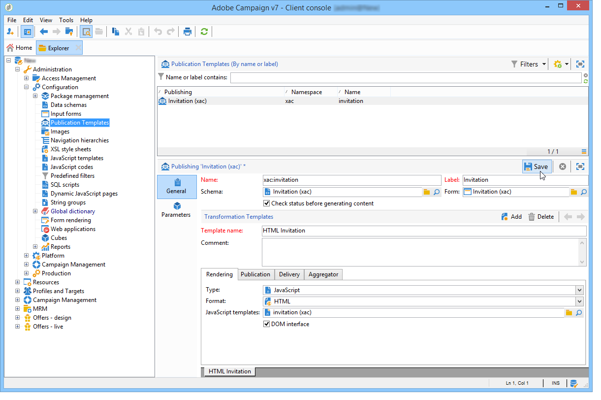 Adobe Campaign 탐색기를 열고 Administration > Configuration > JavaScript Templates 노드 아래에 있어야 합니다.