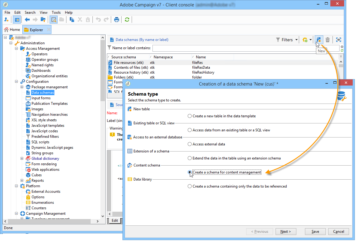 Adobe Campaign 탐색기를 열고 Administration > Configuration > Data schemas 노드 아래에 있어야 합니다.
