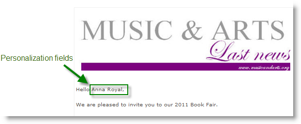 데이터베이스에 저장된 정보(이 경우 수신자의 이름과 성)를 기반으로 동적으로 입력되는 개인화 필드.