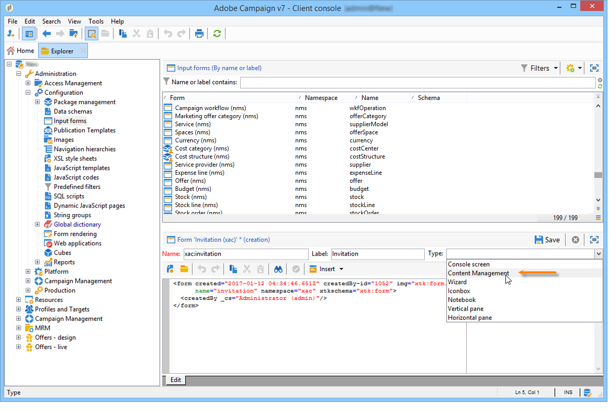 Adobe Campaign 탐색기를 열고 Administration > Configuration > Input forms 노드 아래에 있어야 합니다.