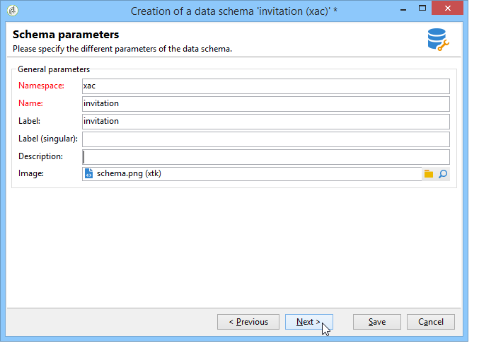 해당 필드에 스키마의 이름과 레이블을 입력합니다. 필요한 경우 설명을 추가하고 특정 이미지를 연결할 수 있습니다.