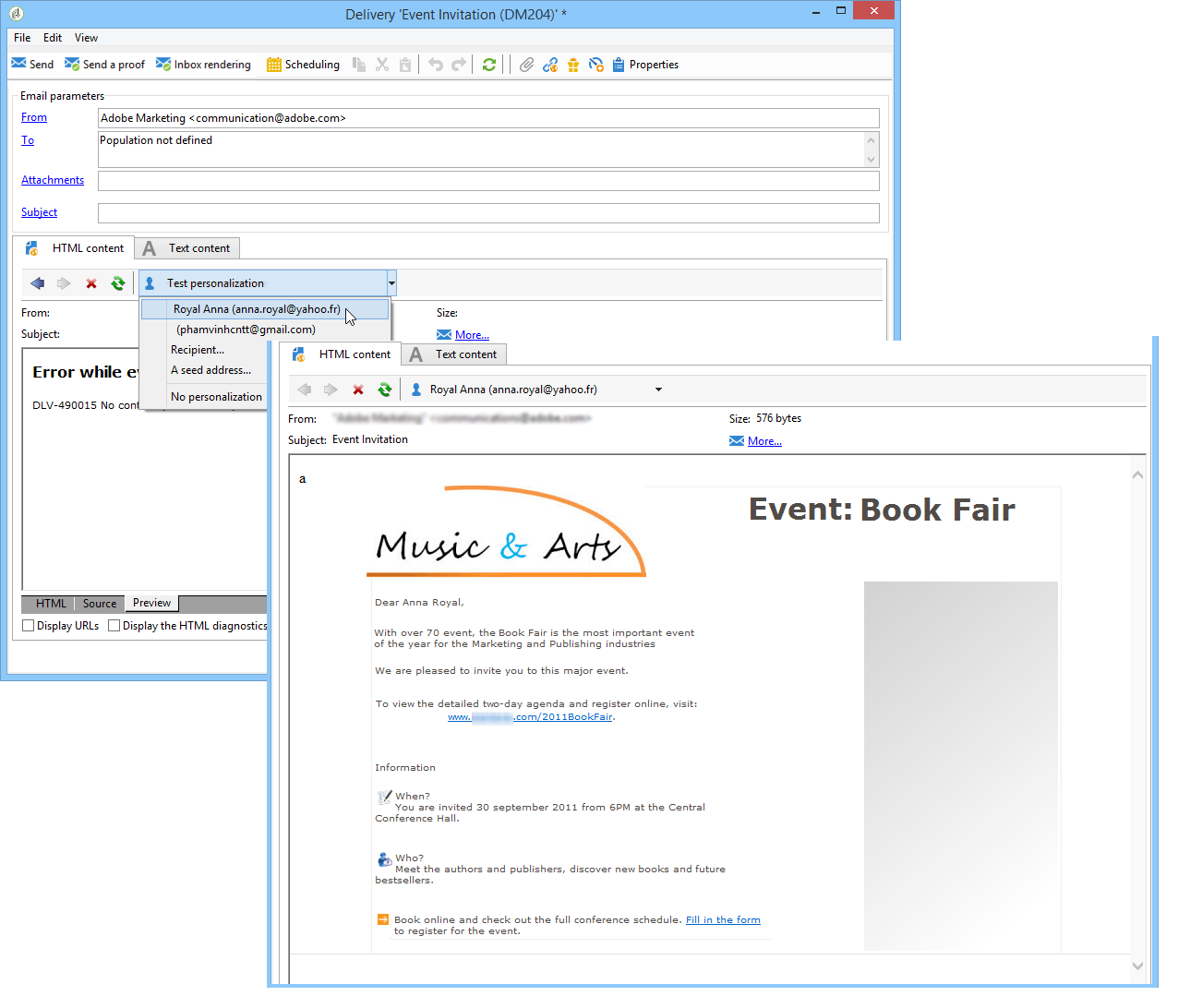 을(를) 클릭합니다. HTML preview 탭을 클릭하여 렌더링을 확인합니다. 개인화를 테스트하려면 수신자를 선택해야 합니다.